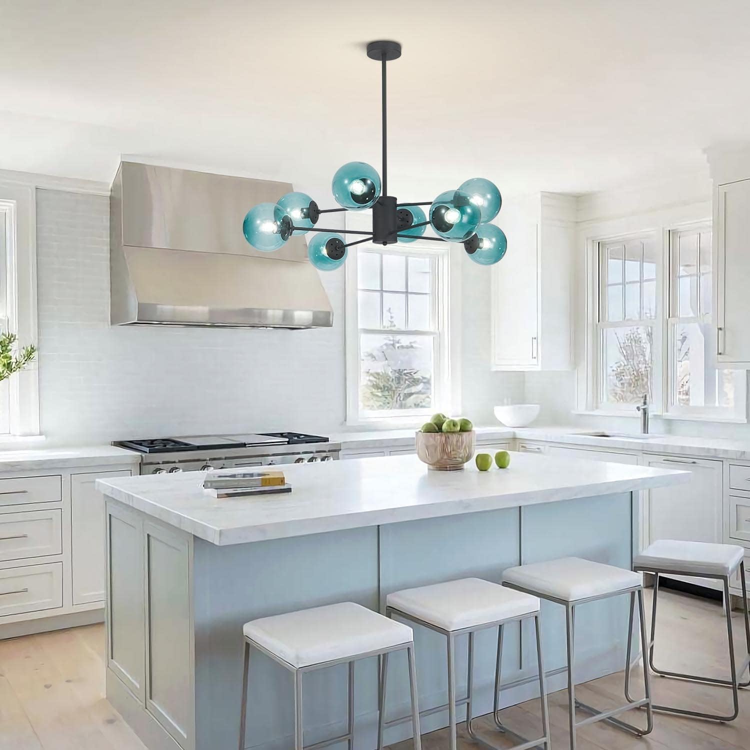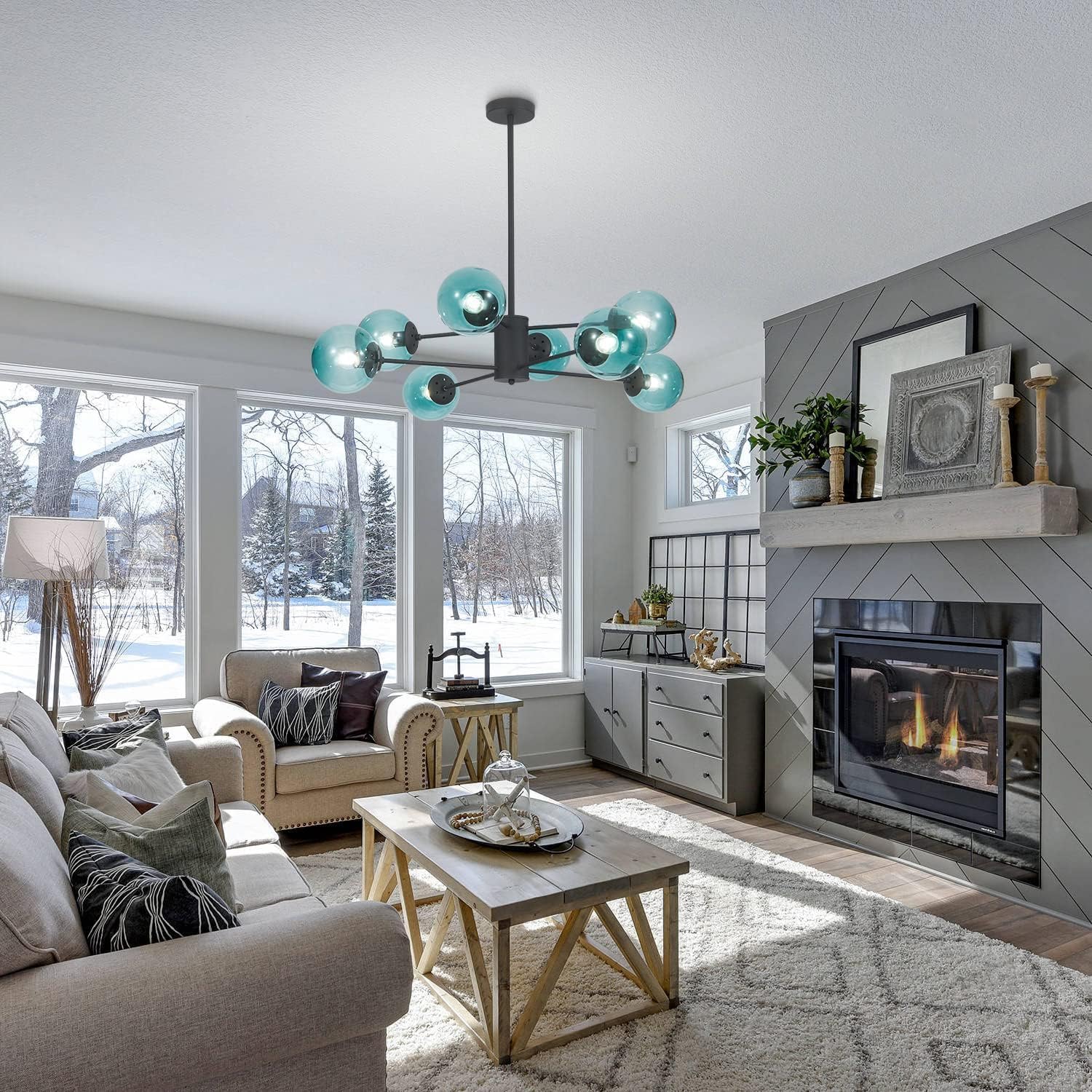 KCO Lighting Modern 8-Lights Blue Glass Sputnik Chandelier Mid-Century Matte Black Globe Flush Mount Chandelier Industrial Large Glass Ball Sputnik Chandelier Pendant Lamp (Black+Blue)