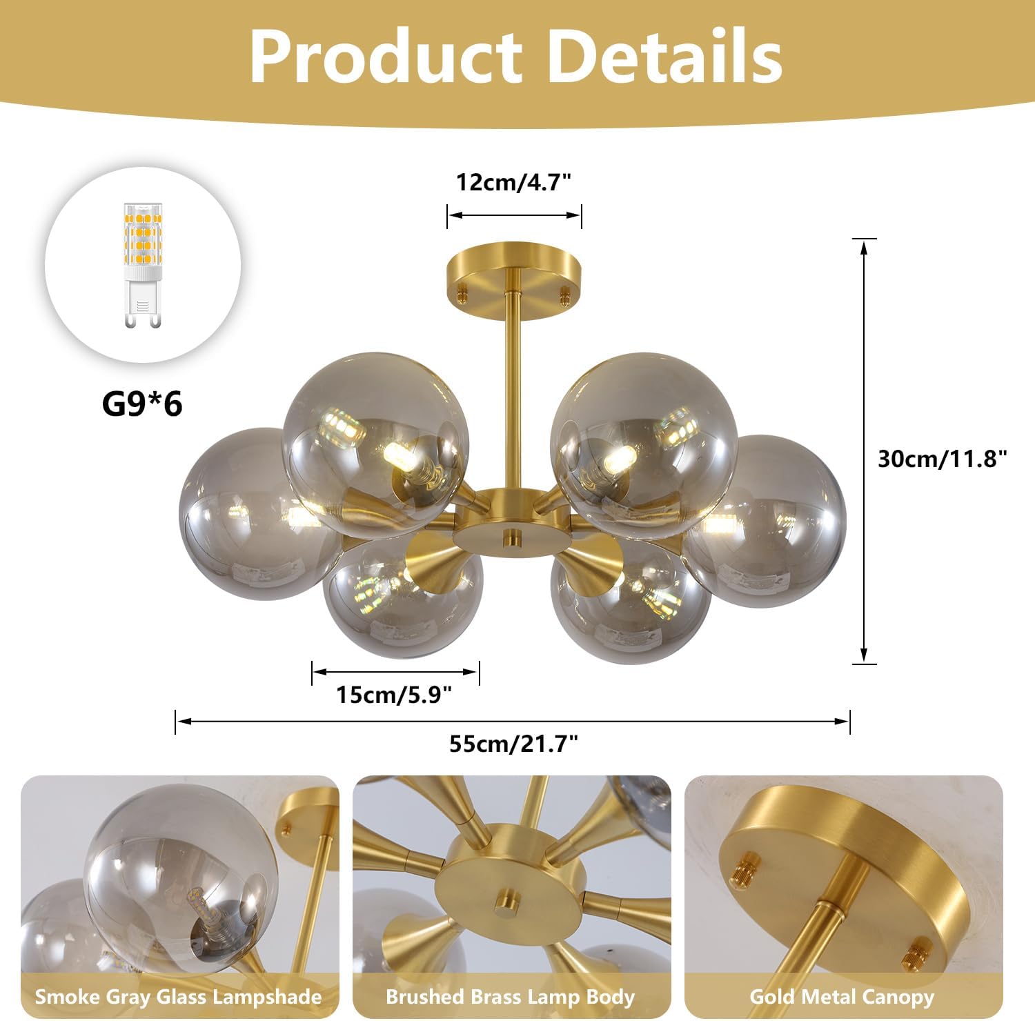 - Ideal Size & Bulb Included: The gold semi concealed ceiling lamp width: 21.7β(55cm), height: 11.8β(30cm), globe diameter: 5.9β(15cm), canopy: 4.7β(12cm). Light source: G9, voltage: 110-240V for worldwide. The gold and smoke gray ceiling light itself is not dimmable, but this bedroom lighting can be dimmable when use with dimmable bulb and dimmable switch