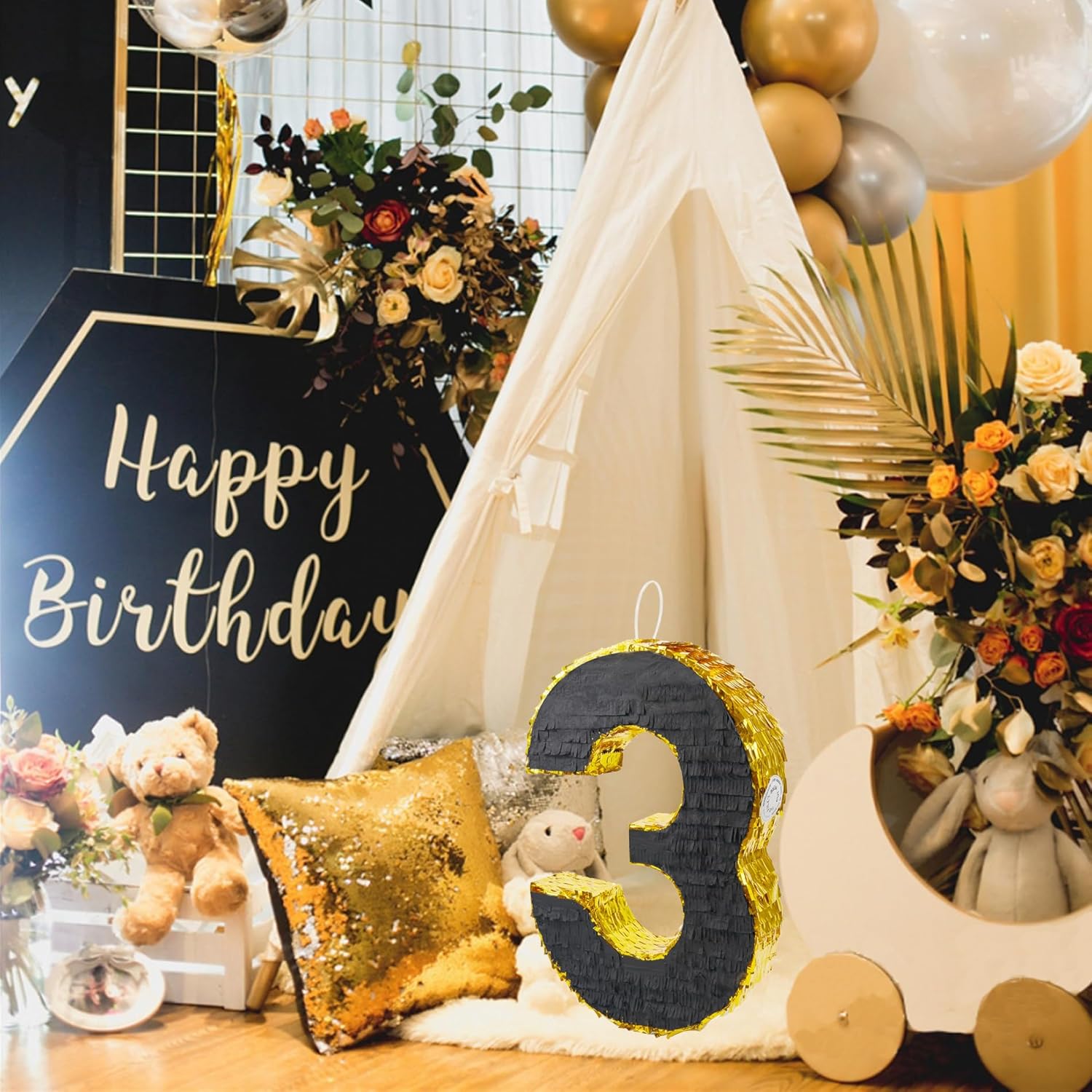 PCFING 20 Inch Number 3 Piñata Gold Black with 30 Inch Piñata Stick Blindfold Confetti for Man Women Boys Girls Birthday Party Decorations, Anniversary Celebration, Fiesta