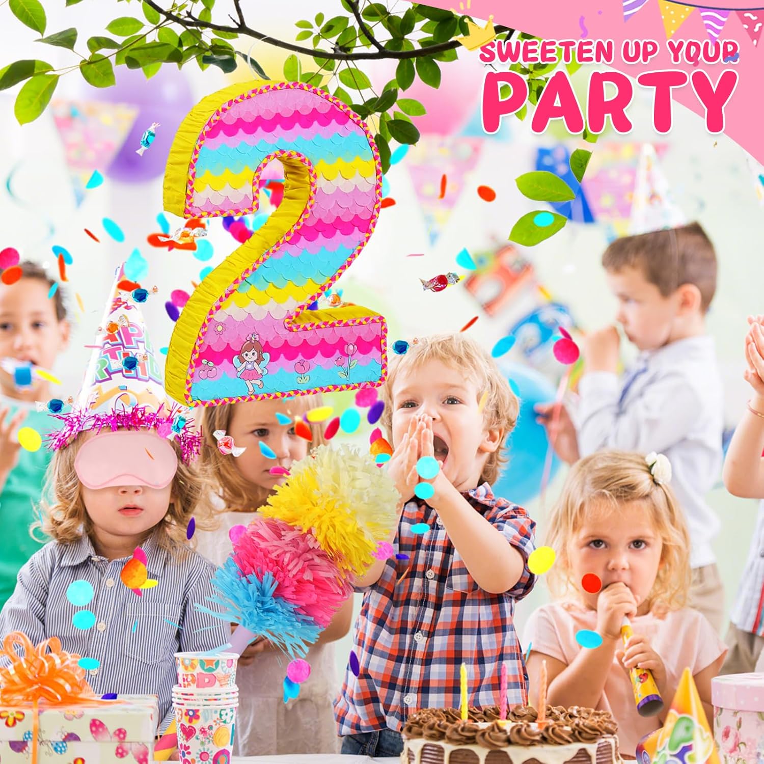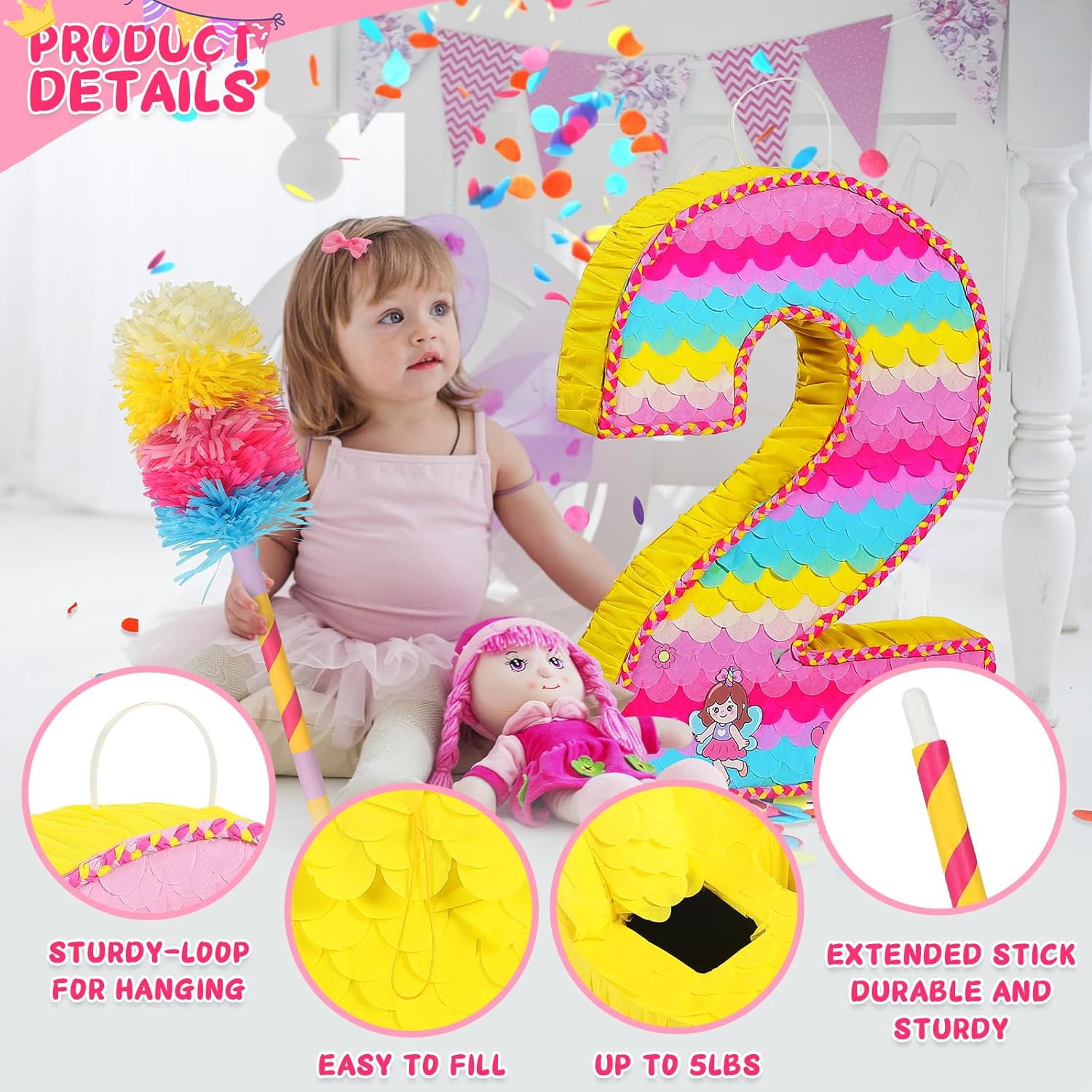 - Happy Birthday Piñata Set: Rainbow-themed number 2 piñata, perfect for pink party decorations, mermaid party decorations. Complete with fabric blindfold, baton, confetti and stickers
